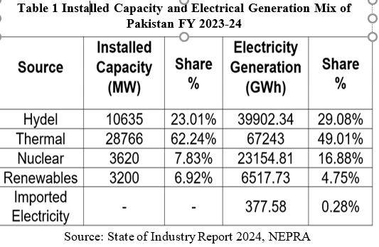 Table 1 Installed Capacity and Electrical Generation Mix of Pakistan FY 2023-24
